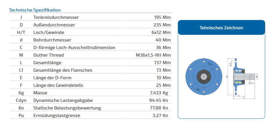 Produktinformationen "IL70-195/6H-M36x1,5 LH / 6-Loch Nabe Links"