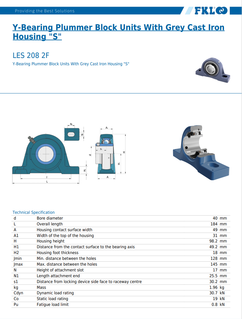 | Beschreibung: | LES 208 2F 40 x 98,2 x 184 mm - FKL Lochabstand: J = 128 - 145 mm Lochgröße: N = 17 x 25,5 mm Wellenmitte: H1 = 49,2 mm 2-Loch Stehlagereinheit |